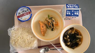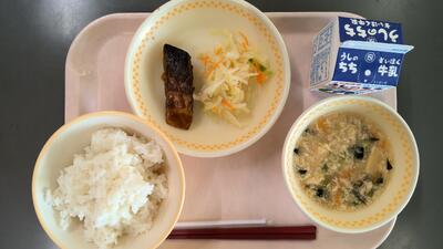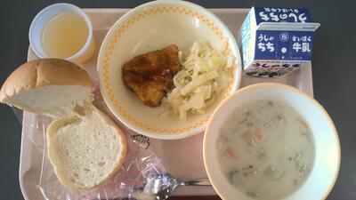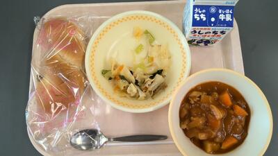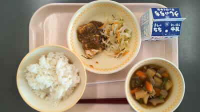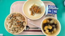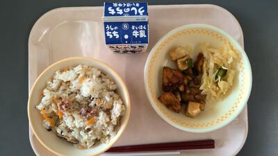 まずは旬の食材「筍」をふんだんに使った「筍ご飯」。炊き込みご飯は、給食の中でも特に手間をかけて作られた献立の一つ。さやえんどう、にんじん、干ししいたけ、油揚げ、鶏肉と具沢山です。