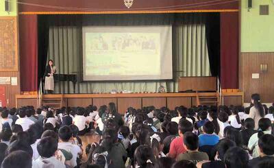 4月28日(火) 今朝は体育館で「お話生活朝会」がありました。